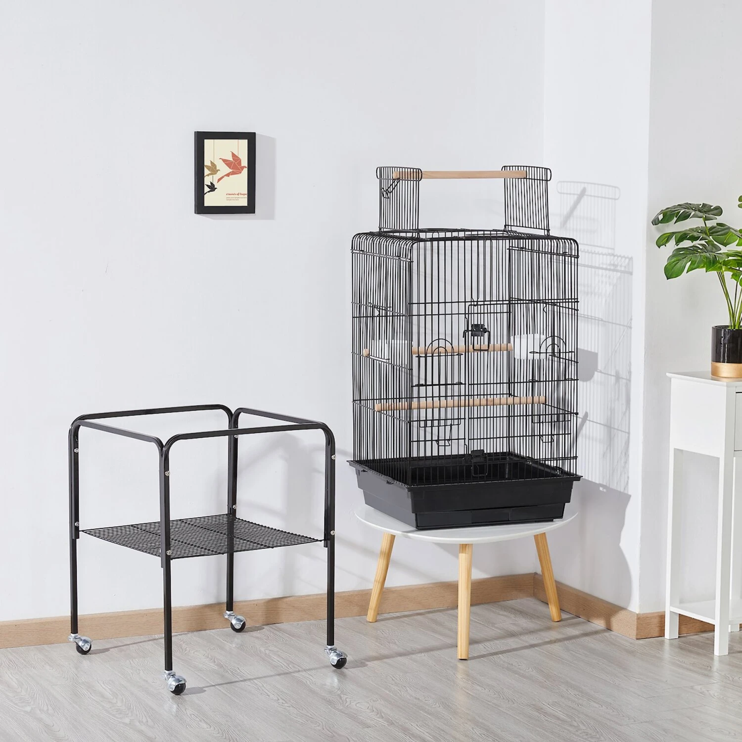 - Storage shelf on the stand provides space for storing cleaning tools, bird seed, toys and more.