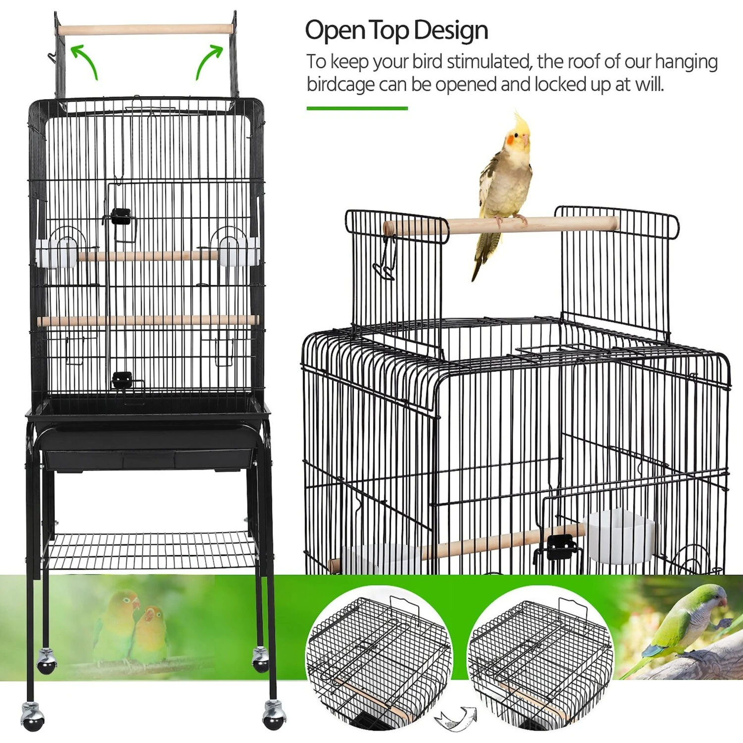 - Spacious bird cage features an interactive play top that can be propped open with the included perch or securely closed to keep birds safely in.