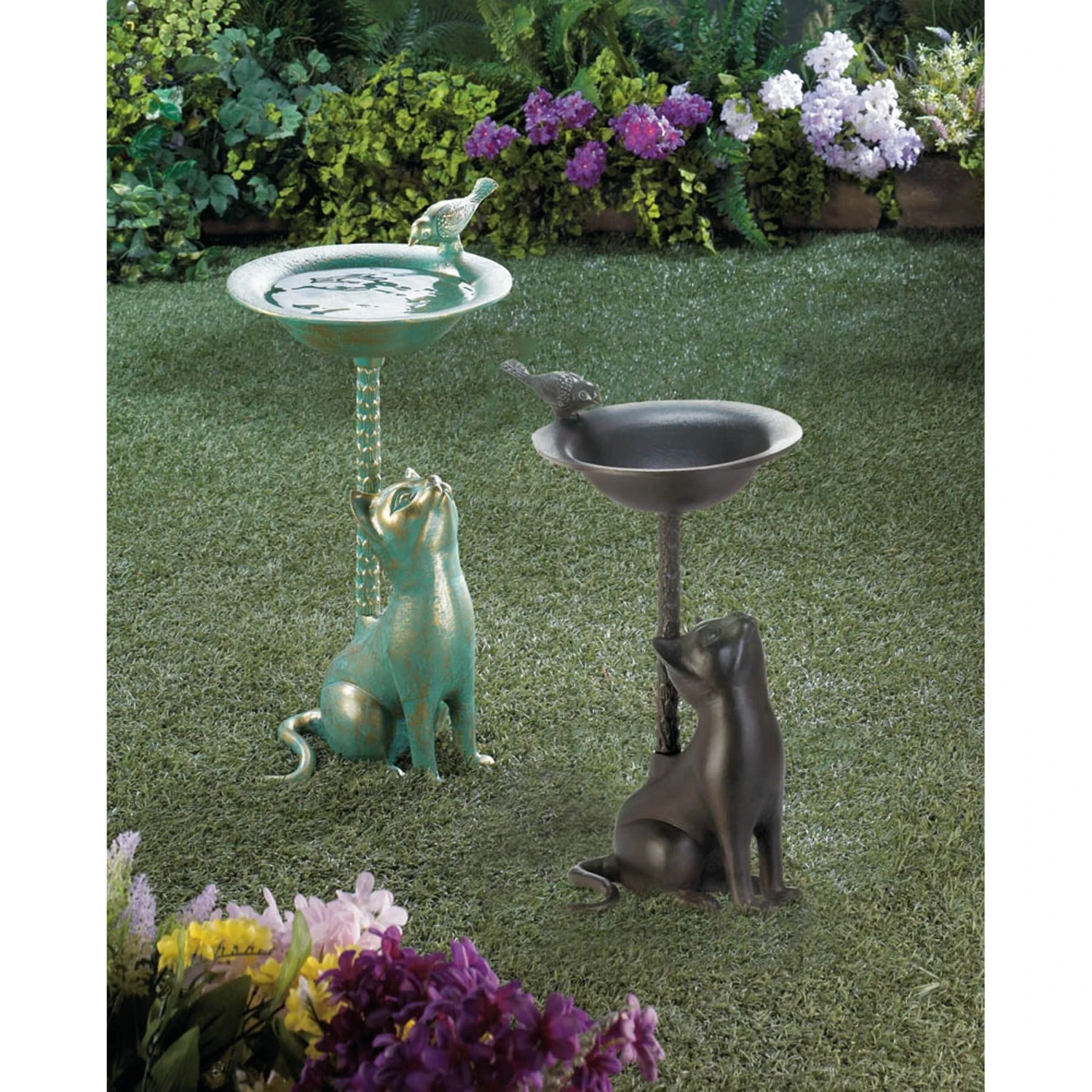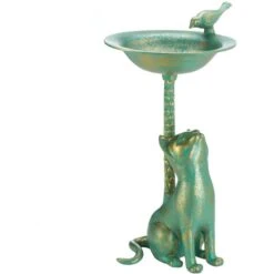- Lovely metal birdbath features a hungry-looking cat at its base and a sweet sparrow on its brim.
