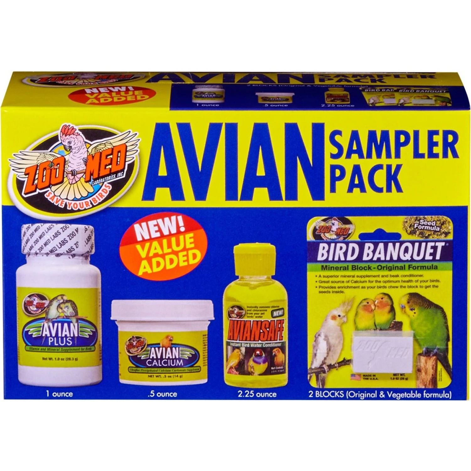 - Sample pack contains Avian Plus, Avian Calcium, AvianSafe Water Conditioner and Bird Banquet Mineral Blocks