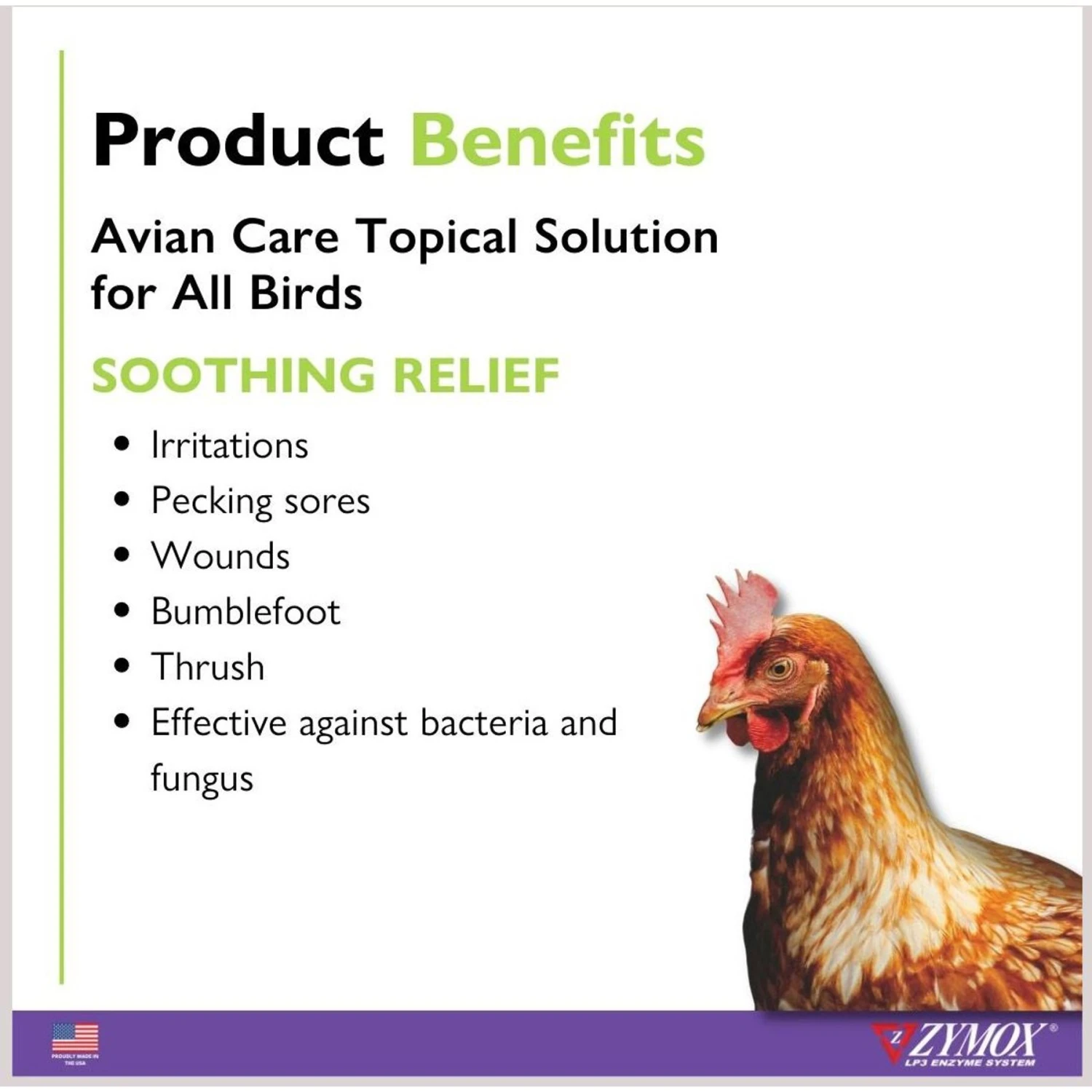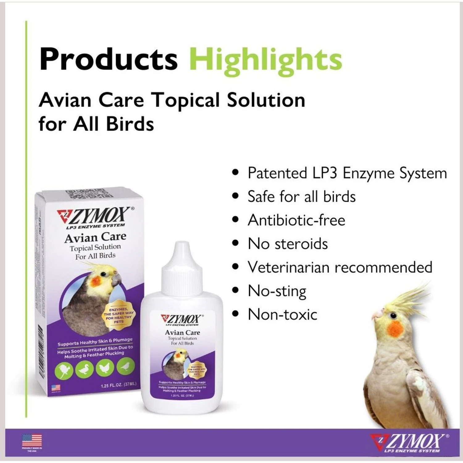 - ZYMOX Avian Care Topical Solution supports healthy skin and plumage while soothing dry, irritated skin.